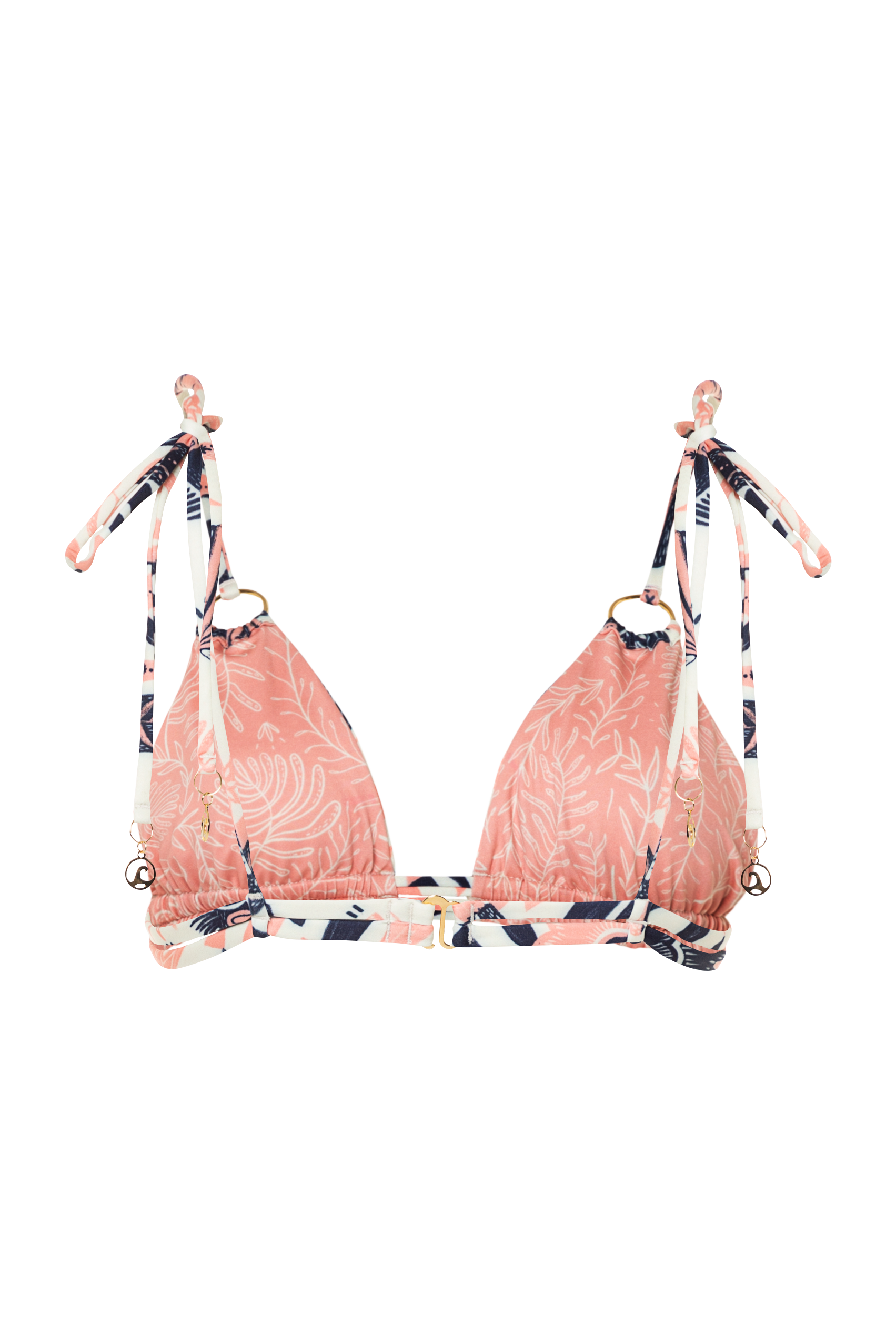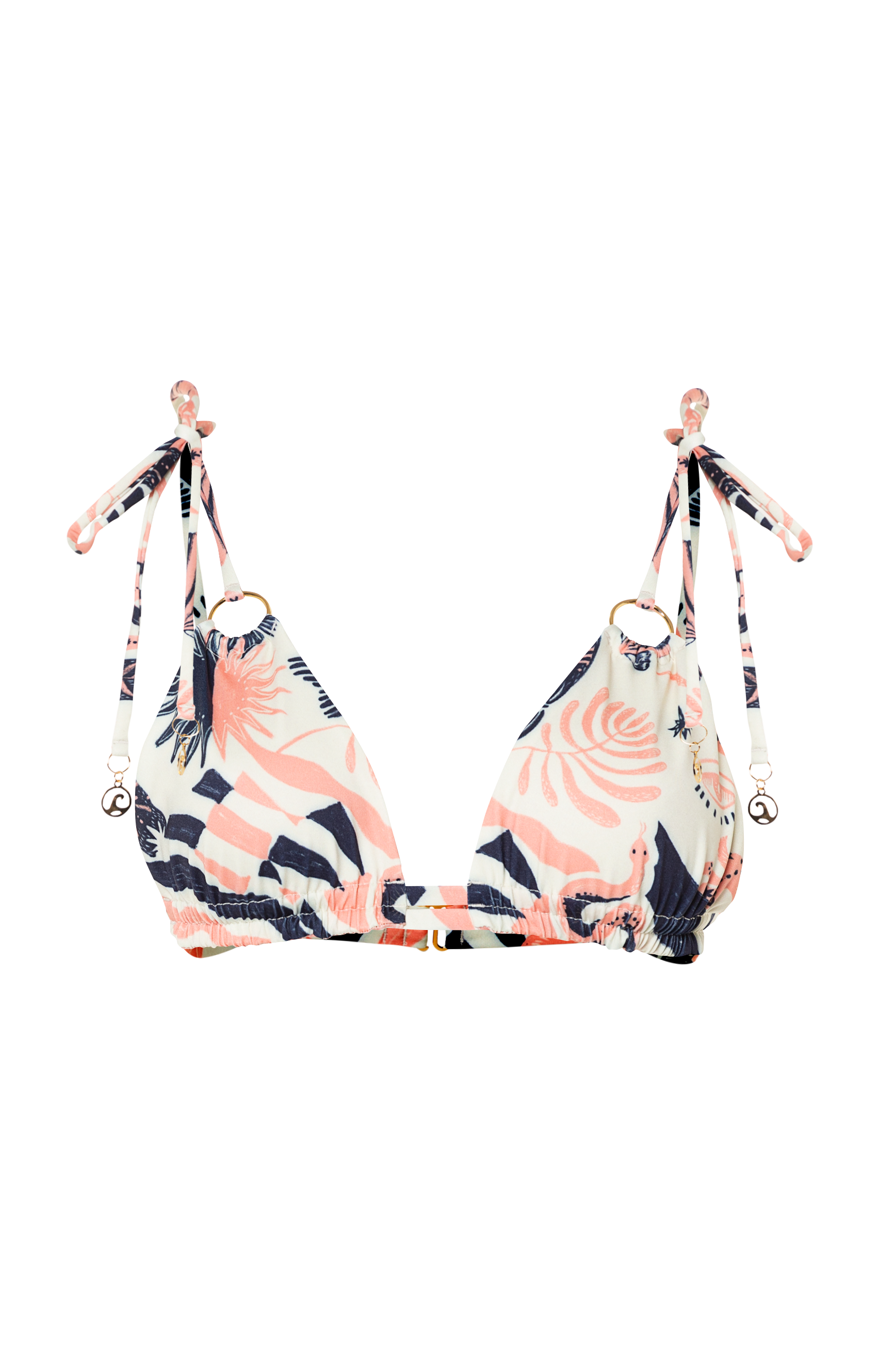 Top triangular con argollas doradas al frente y ajuste en los hombros para un look sofisticado y a la vez atemporal con un toque moderno diseñado.